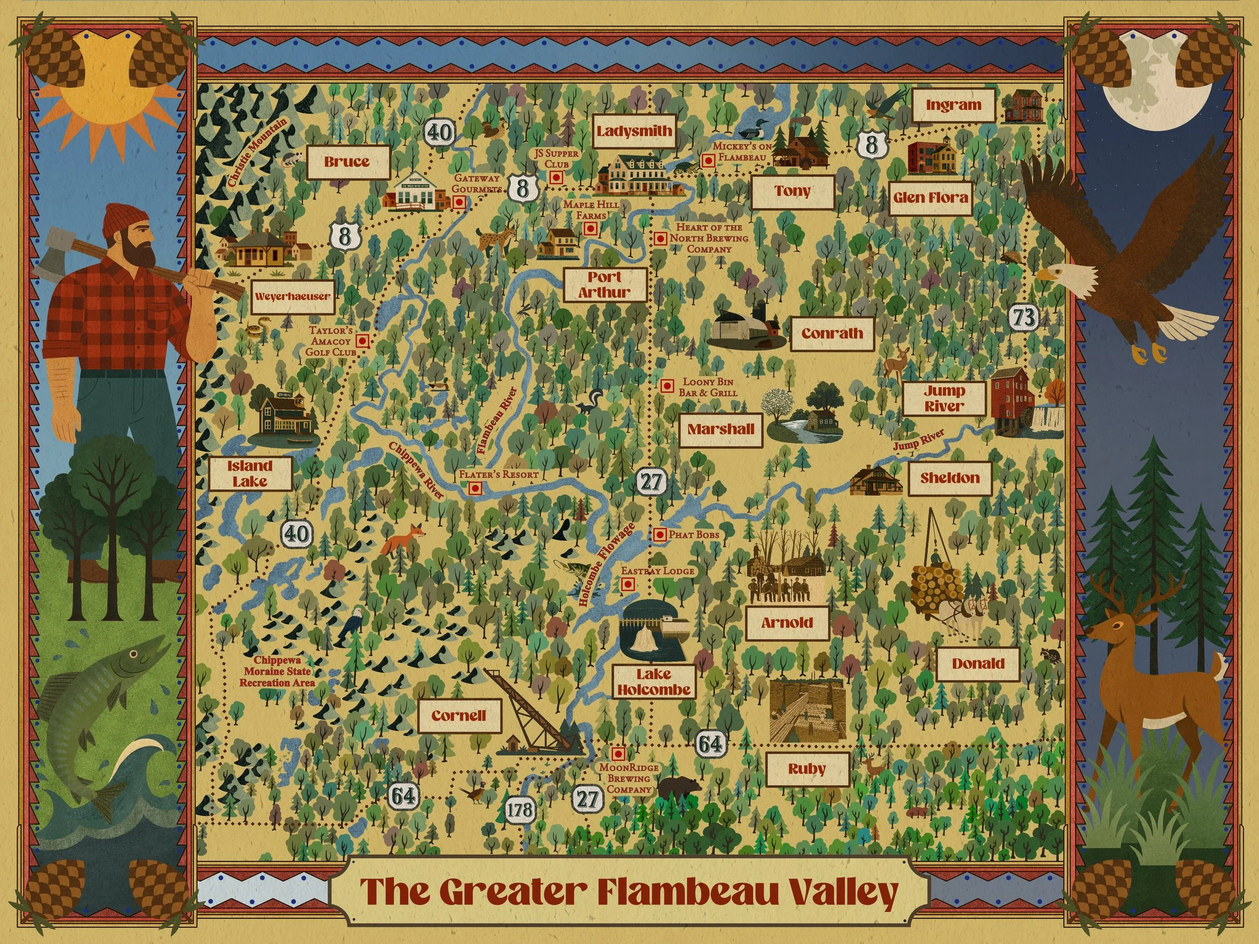 An illustrated regional map capturing the natural character and quiet landmarks of northern Wisconsin. Hand-drawn with layered textures and expressive linework, this piece blends cartography with fine-art illustration to honor the landscape’s history, wildlife, and local identity.