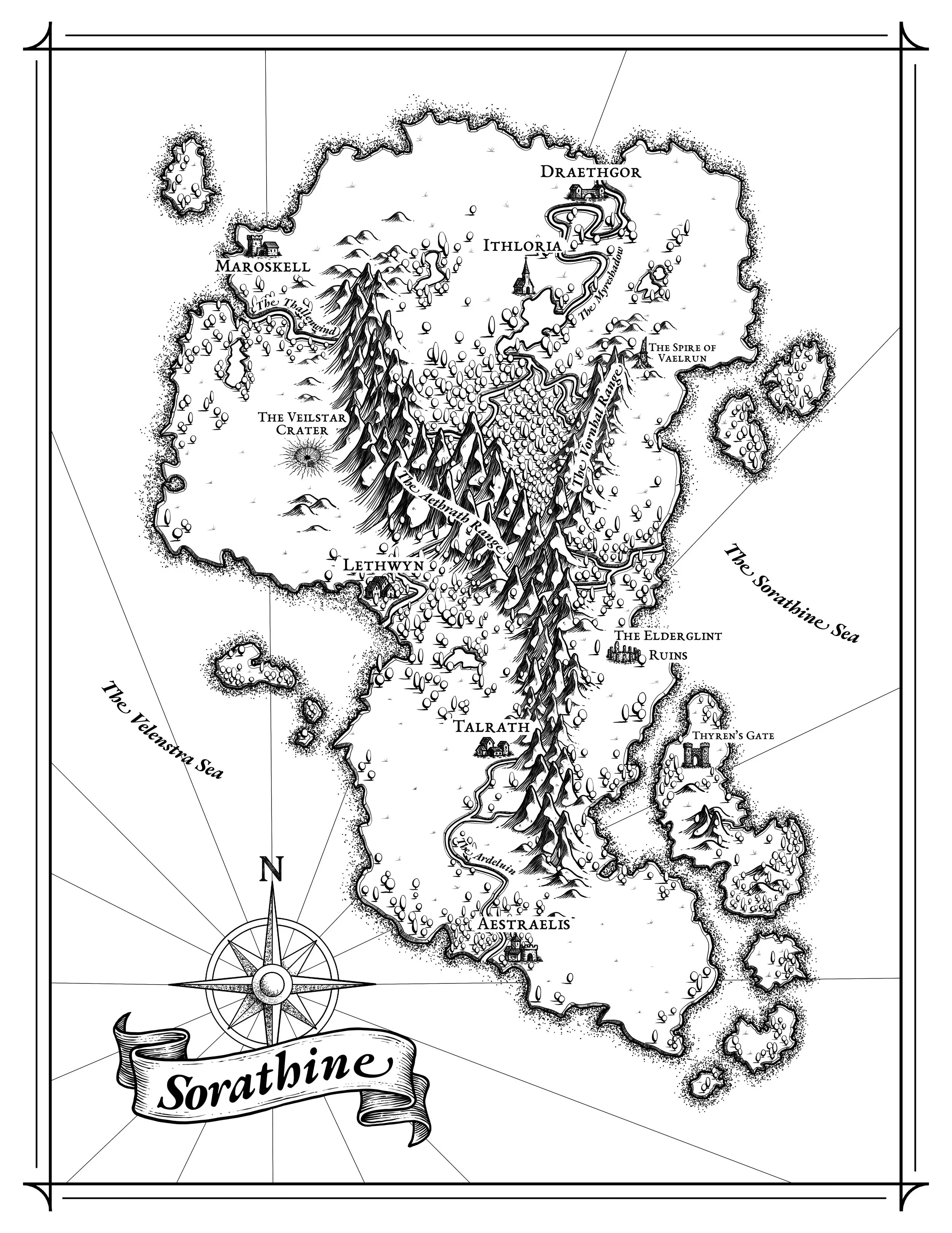 A hand-drawn black-and-white regional map of Sorathine, featuring detailed ink linework, stippled coastlines, and story-rich landmarks. This piece showcases my traditional illustration process—mountain ranges, forests, rivers, settlements, and ancient ruins rendered entirely by hand to create a cohesive, readable, and atmospheric fantasy setting that will look incredible printed inside a book.